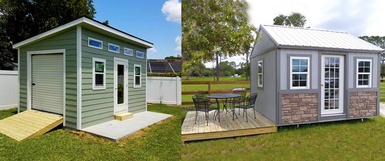 Suncoast Building Sales is the largest distributor in Central Florida specializing in Sheds, Metal Buildings, and Tiny Homes. Whether you are in the market for a backyard utility shed or a She-shed for the wife, we can help. We can also help with metal buildings of just about any size, even commercial buildings ranging from small office space to large commercial red iron structures. We can handle the permitting and have architects at your service. We can also assist with land clearing, concrete slabs, tree service, pavers, fencing and more. Come visit our large showroom lot and see all that we have in stock as well as what we can order for you or custom design your own.